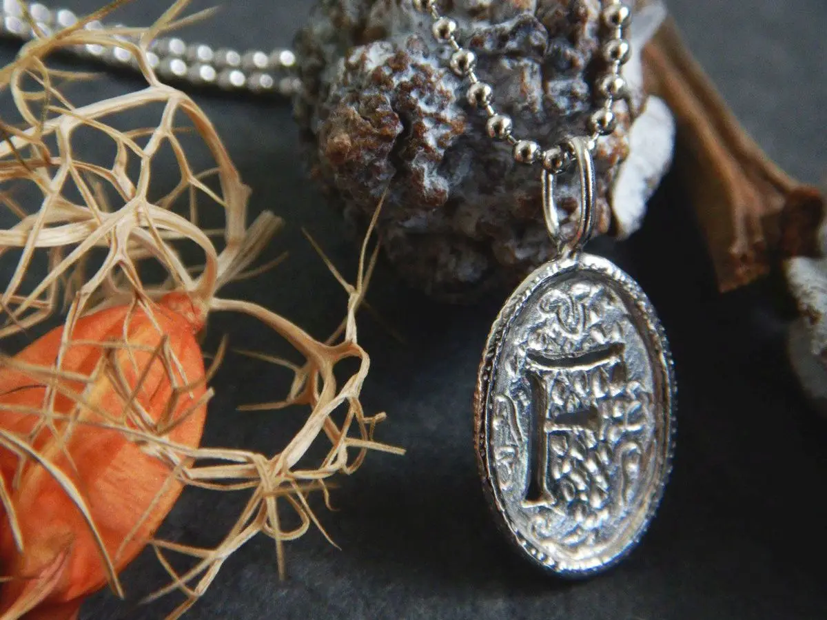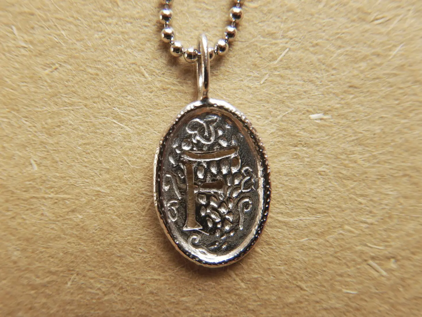 イニシャルシリーズのネックレス。「F」の文字の周囲に藤の花の彫りが施してあります。裏面は鏡面仕上げで刻印が入っています。