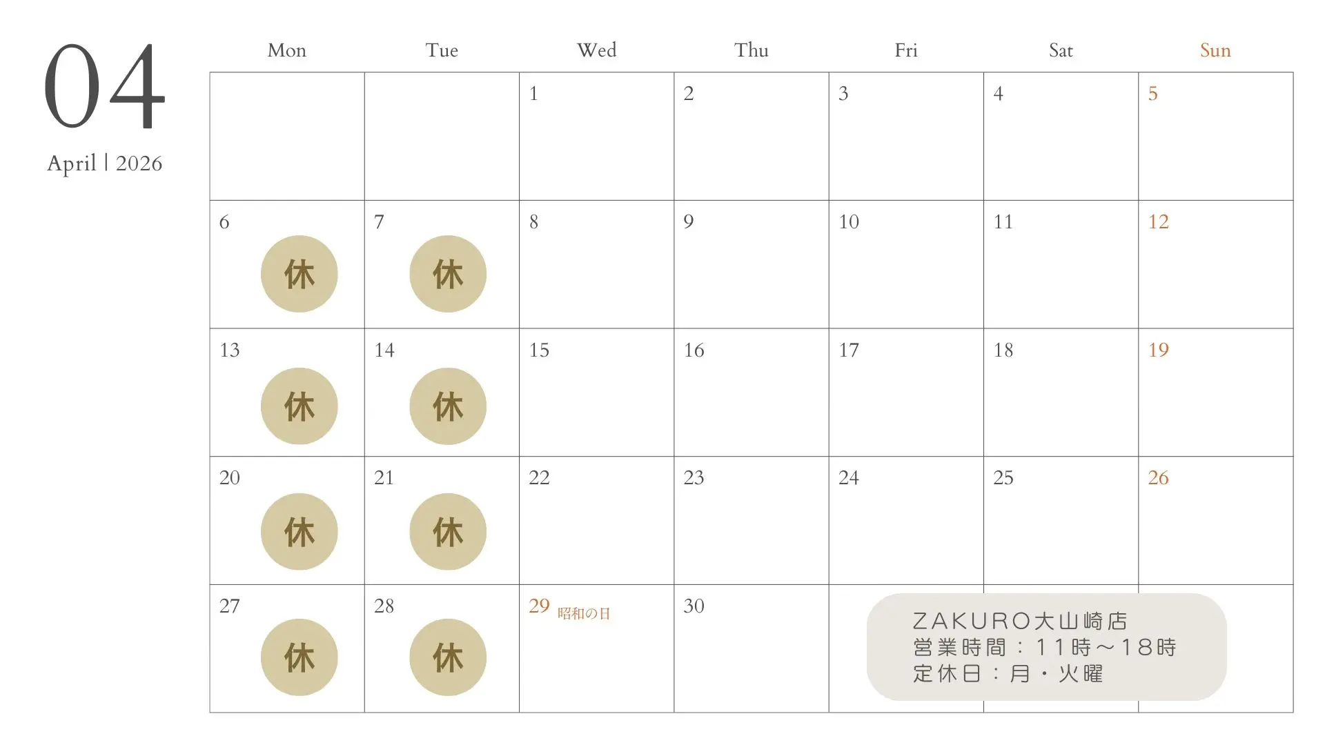 【2026年4月の営業日のお知らせ】