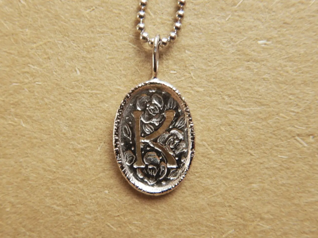 イニシャルシリーズのネックレス。「K」の文字の周囲に椿の彫りが施してあります。裏面は鏡面仕上げで刻印が入っています。